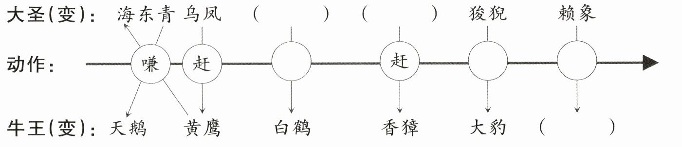 这大圣收了金箍棒,捻诀念咒,摇身一变,变作一个海东青,飕的一翅,钻在云眼里,倒飞下来,落在天鹅身上,抱住颈项嗛眼。那牛王也知是孙行者变化,急忙抖抖翅,变作一只黄鹰,返来嗛海东青。行者又变作一个乌凤,专一赶黄鹰。牛王识得,又变作一只白鹤,长唳一声,向南飞去。行者立定,抖抖翎毛,又变作一只丹凤,高鸣一声。那白鹤见凤是鸟王,诸禽不敢妄动,刷的一翅,淬下山崖,将身一变,变作一只香獐,乜(miē)乜些些,在崖前吃草。行者认得,也就落下翅来,变作一只饿虎,剪尾跑蹄,要来赶獐作食。魔王慌了手脚,又变作一只金钱花斑的大豹,要伤饿虎。行者见了,迎着风,把头一幌,又变作一只金眼狻猊(suān ní),声如霹雳,铁额铜头,复转身要食大豹。牛王着了急,又变作一个人熊,放开脚,就来擒那狻猊。行者打个滚,就变作一只赖象,鼻似长蛇,牙如竹笋,撒开鼻子,要去卷那人熊。