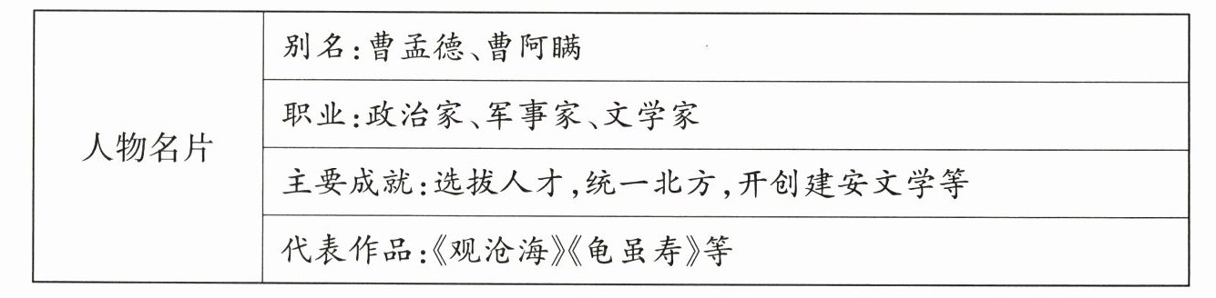 4. 〔开放题〕请你结合选文和下面的人物名片,联系自己的阅读经历,写写你对曹操的评价并说明理由。(3分)