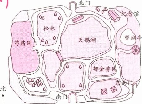 一、看右图,按照一定的顺序游览植物园,并写下来。(5分)