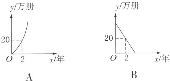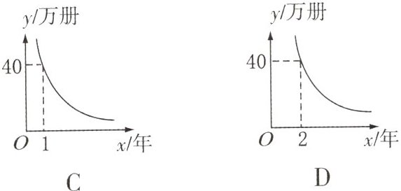 3. 一台印刷机每年可印刷的书本数量$y$(万册)与它的使用时间$x$(年)成反比例关系,当$x = 2$时,$y = 20$,则$y$与$x$的函数图象大致是( ).