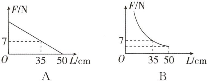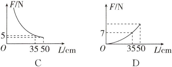 1. 如图,取一根长100 cm的匀质木杆,用细绳绑在木杆的中点O并将其吊起来,在中点O的左侧距离中点O 25 cm($L_{1}=25$ cm)处挂一个重9.8 N($F_{1}=9.8$ N)的物体,在中点O的右侧用一个弹簧秤向下拉,使木杆处于水平状态. 弹簧秤与中点O的距离L(单位:cm)及弹簧秤的示数F(单位:N)满足$FL = F_{1}L_{1}$. 以L的数值为横坐标,F的数值为纵坐标建立直角坐标系. 则F关于L的函数图象大致是( ).
