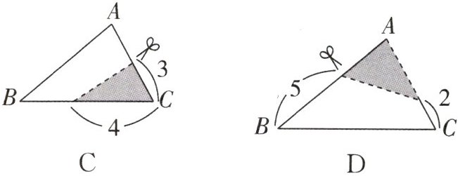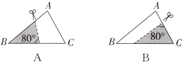 10. 如图,在△ABC中,∠A = 80°,AB = 8,AC = 6,将△ABC沿图示中的虚线剪开,剪下的阴影三角形与△ABC不相似的是( ).