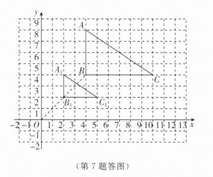 7. 如图,在平面直角坐标系中,$\triangle ABC$各顶点的坐标分别是$A(4,8)$,$B(4,4)$,$C(10,4)$,$\triangle A_1B_1C_1$与$\triangle ABC$关于原点$O$位似,$A$,$B$,$C$的对应点分别为$A_1$,$B_1$,$C_1$,其中$B_1$的坐标是$(2,2)$.