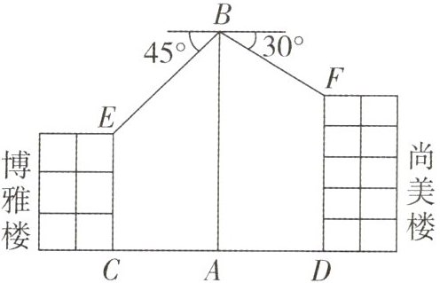 4. 综合实践课上,航模小组用航拍无人机进行测高实践. 如图,无人机从地面$CD$的中点$A$处竖直上升$30$米到达$B$处,测得博雅楼顶部$E$的俯角为$45^{\circ}$,尚美楼顶部$F$的俯角为$30^{\circ}$,已知博雅楼高度$CE$为$15$米,则尚美楼高度$DF$为_______米.(结果保留根号)