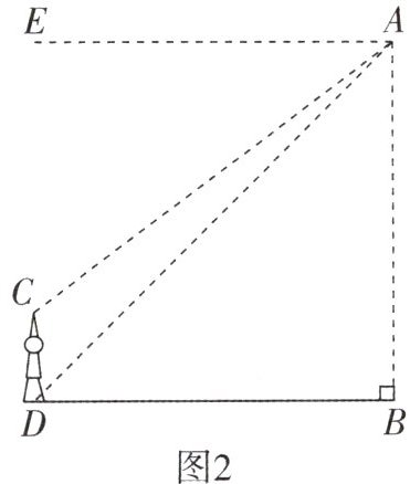 6. 图1中的吉林省广播电视塔,又称“吉塔”. 某直升机于空中$A$处探测到吉塔,此时飞行高度$AB = 873$m,如图2,从直升机上看塔尖$C$的俯角$\angle EAC = 37^{\circ}$,看塔底$D$的俯角$\angle EAD = 45^{\circ}$,求吉塔的高度$CD$(结果精确到$0.1$m).(参考数据:$\sin37^{\circ}\approx0.60$,$\cos37^{\circ}\approx0.80$,$\tan37^{\circ}\approx0.75$)