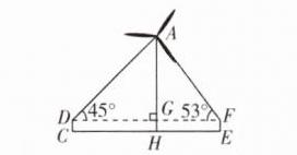 5. 习近平总书记于2021年指出,中国将力争2030年前实现碳达峰、2060年前实现碳中和. 甘肃省风能资源丰富,风力发电发展迅速. 某学习小组成员查阅资料得知,在风力发电机组中,“风电塔筒”非常重要,它的高度是一个重要的设计参数. 于是小组成员开展了“测量风电塔筒高度”的实践活动. 如图,已知一风电塔筒$AH$垂直于地面,测角仪$CD$,$EF$在$AH$两侧,$CD = EF = 1.6$m,点$C$与点$E$相距$182$m(点$C$,$H$,$E$在同一条直线上),在$D$处测得筒尖顶点$A$的仰角为$45^{\circ}$,在$F$处测得筒尖顶点$A$的仰角为$53^{\circ}$. 求风电塔筒$AH$的高度.(参考数据:$\sin53^{\circ}\approx\frac{4}{5}$,$\cos53^{\circ}\approx\frac{3}{5}$,$\tan53^{\circ}\approx\frac{4}{3}$)