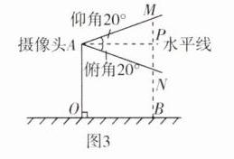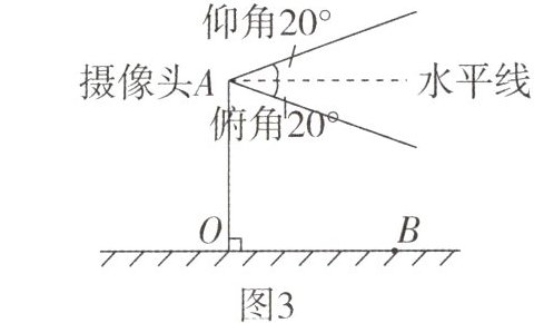 (2)身高$120$cm的小若,头部高度为$15$cm,踮起脚尖可以增高$3$cm,但仍无法被识别. 社区及时将摄像头的仰角、俯角都调整为$20^{\circ}$(如图3),此时小若能被识别吗?请计算说明.(结果精确到$0.1$cm,参考数据$\sin15^{\circ}\approx0.26$,$\cos15^{\circ}\approx0.97$,$\tan15^{\circ}\approx0.27$,$\sin20^{\circ}\approx0.34$,$\cos20^{\circ}\approx0.94$,$\tan20^{\circ}\approx0.36$)