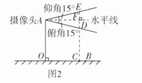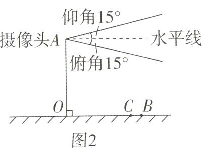 13. 图1是某住宅单元楼的人脸识别系统(整个头部需在摄像头视角范围内才能被识别),其示意图如图2,摄像头$A$的仰角、俯角均为$15^{\circ}$,摄像头高度$OA = 160$cm,识别的最远水平距离$OB = 150$cm.