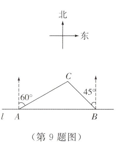 9. 如图,在一笔直的沿湖道路l上有A、B两个游船码头,观光岛屿C在码头A北偏东60°的方向,在码头B北偏西45°的方向,AC=4 km.游客小张准备从观光岛屿C乘船沿CA回到码头A或沿CB回到码头B,设开往码头A,B的游船速度分别为v1,v2,若回到A,B所用时间相等,则$\frac{v_{1}}{v_{2}}$=_______.(结果用根号表示)