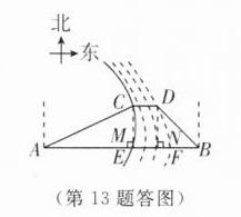 13. 如图,有一条河流自北向南穿过某公园,河流的上游有一座桥梁CD,A地和B地都有休闲步道与桥梁CD相连.为方便市民游览,在河流的下游新建了桥梁EF和休闲步道AE,BF(点A,E,F,B在同一水平直线上),桥梁EF与桥梁CD平行,且EF=1.5CD.经过测量,桥梁CD的一端C在A地的北偏东65°方向,另一端D在B地的北偏西45°方向,B地在A地的正东方向.A、B两地相距870米,A、C两地相距650米.