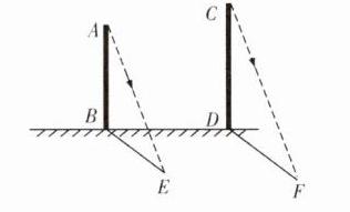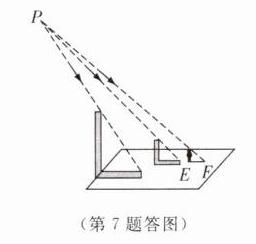 7 如图所示是两根标杆及它们在灯光下的影子. 请在图中画出光源的位置(用点P表示),并在图中画出人在此光源下的影子(用线段EF表示).