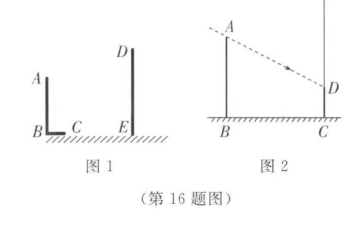 16【基础解答】如图1,AB和DE是直立在地面上的两根立柱. AB = 6 m,某一时刻AB在阳光下的投影BC = 2 m,DE在阳光下的投影长为3 m. 根据题中信息,求立柱DE的长.