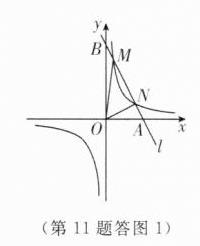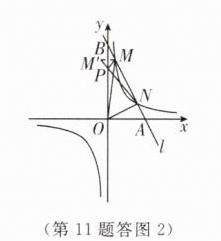 11. 如图,在平面直角坐标系中,一次函数的图象l与反比例函数$y = \frac{k}{x}$的图象交于$M(\frac{1}{2},4)$,N(n,1)两点.