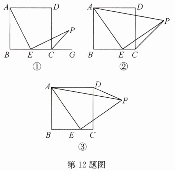 12(2022·兰州,难)【问题情境】:数学活动课上,老师出示了一个问题:如图①,在正方形ABCD中,E是BC的中点,AE⊥EP,EP与正方形的外角DCG的平分线交于点P.试猜想AE与EP的数量关系,并加以证明.
