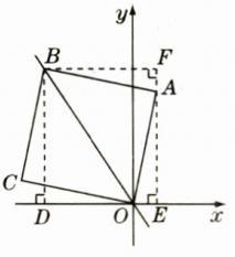 $(1, 7)$ 解析:如图,作$BD\perp x$轴于点$D$。由正方形$OABC$的面积为$50$,可得$OB = 10$。设点$B$的横坐标为$m$,则纵坐标为$-\frac{4}{3}m$。在$Rt\triangle BOD$中,$OD^2 + BD^2 = OB^2$,即$m^2 + (-\frac{4}{3}m)^2 = 10^2$,解得$m = \pm6$。取$m = -6$,$-\frac{4}{3}m = -\frac{4}{3}×(-6) = 8$,$\therefore$点$B$的坐标为$(-6, 8)$。过点$A$作$x$轴的垂线$AE$,垂足为点$E$,过点$B$作$AE$的垂线$BF$,垂足为点$F$。设点$A$的坐标为$(a, b)$,易证$\triangle AOE\cong\triangle BAF$。$\therefore AF = OE = a$,$BF = AE = b$,由点$B$的坐标为$(-6, 8)$,可得$b - a = 6$,$b + a = 8$,解得$a = 1$,$b = 7$。$\therefore$点$A$的坐标为$(1, 7)$。