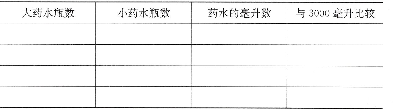 3. 仪器架上有大、小两种药水瓶18个,共装药水3000毫升。每个大瓶装药水250毫升,每个小瓶装药水100毫升。大、小药水瓶各有多少个?(在表中填一填,想一想,找出答案)