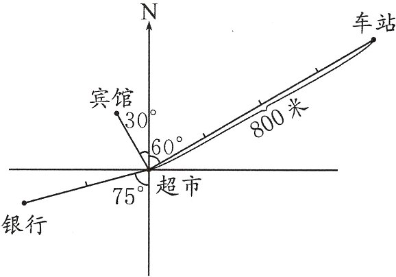 (1) 车站位于超市( )偏( )( )°方向,实际距离为( )米。