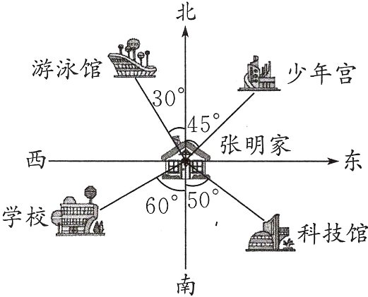 (2) 游泳馆在张明家北偏( )( )°方向。