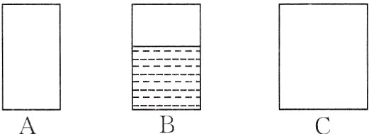 5. 右边各容器的底面积都不相等。在这三个容器中倒入同样多的水,根据B容器中水的高度,估计出A和C容器中水的高度并画出来,然后说出这样画的理由。
