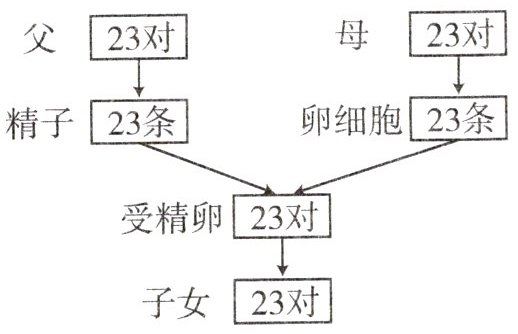 D 解析:染色体在体细胞内成对存在,亲代在形成生殖细胞时,每对染色体都要分开,分别进入不同的生殖细胞中,在生殖细胞内减半。当精子和卵细胞结合形成受精卵后,受精卵中的染色体又恢复到和体细胞一样的数目。