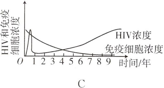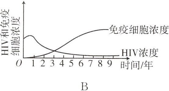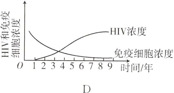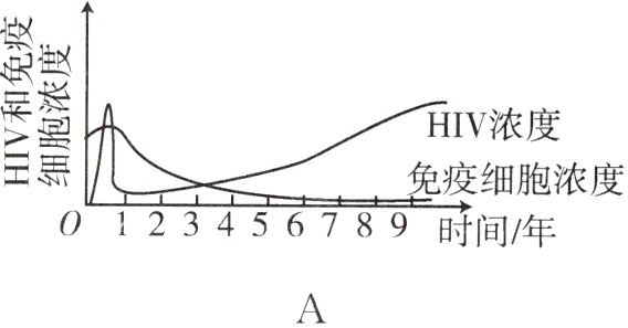 A 解析:根据题意分析:HIV最初侵入人体时,会迅速繁殖,这时体液中HIV的浓度会迅速升高。与此同时,HIV的入侵会刺激人体免疫细胞迅速增加来抵抗HIV,这时免疫细胞的浓度会处于较高水平。在免疫细胞的作用下,HIV的浓度会逐渐下降。存留下来的HIV经过一段时间的潜伏繁殖,逐渐恢复到浓度较高的水平,在HIV的破坏下,免疫系统失去抵抗HIV的功能,免疫细胞浓度逐渐下降。