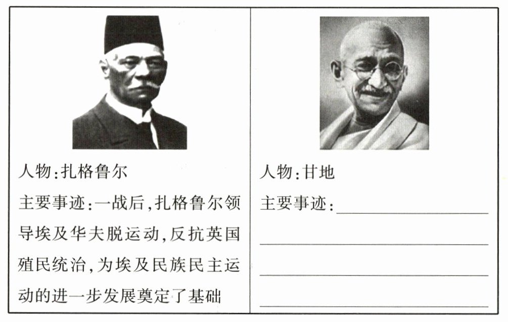 (4)(★☆☆)民族民主运动的发展历程中,甘地、扎格鲁尔均作出了巨大贡献,请你仿照左边示例,将右边人物名片补充完整。(2分) H9203005