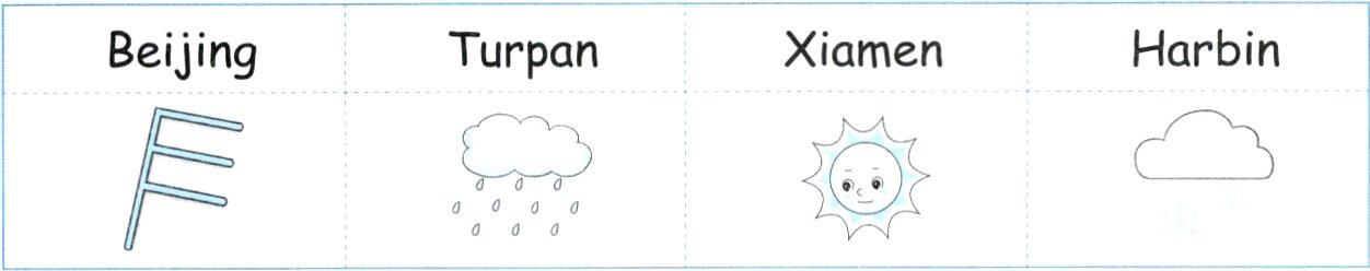 Good morning. This is the weather report. It's 1. ______ in Beijing. It's 2. ______ in Turpan. It's 3. ______ in Xiamen. It's 4. ______ in Harbin.