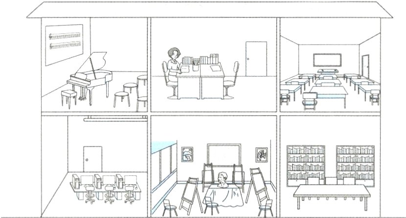I'm Amy. This is my new school. Look! This is our 1.________. We can draw pictures in it. The library is 2.________ the art room. There are many books in it. The computer room is on the 3.________ floor.