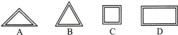 11.手工制作课,小红利用一些花布的边角料,剪裁后装饰手工画,下面四个图案是她剪裁出的空心等腰直角三角形、等边三角形、正方形、矩形花边,其中,每个图案花边的宽度都相等,那么每个图案中花边的内外边缘所围成的几何图形不相似的是( )