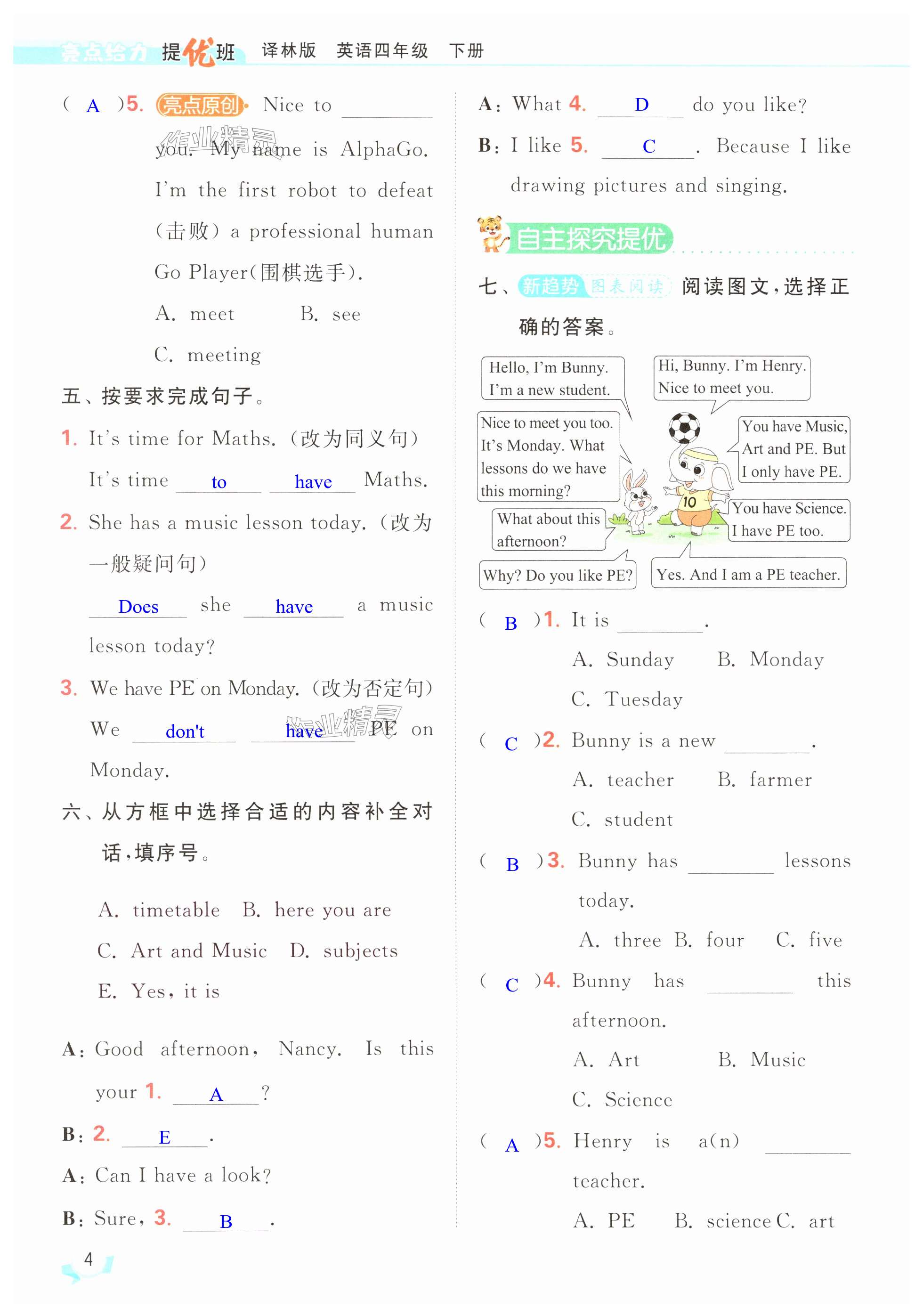 注:目前有些书本章节名称可能整理的还不是很完善,但都是按照顺序排列的,请同学们按照顺序仔细查找。练习册 2025年亮点给力提优班四年级英语下册译林版 答案主要是用来给同学们做完题方便对答案用的,请勿直接抄袭。