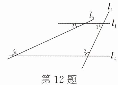 12. 如图,l₁//l₂,且分别与l₃,l₄相交,∠1与∠2互余,∠3 = 115°,求∠4的度数.