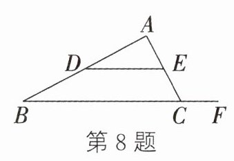 8. (2023·杭州)如图,点 $ D $,$ E $ 分别在三角形 $ ABC $ 的边 $ AB $,$ AC $ 上,且 $ DE // BC $,点 $ F $ 在线段 $ BC $ 的延长线上。若 $ \angle ADE = 28^{\circ} $,$ \angle ACF = 118^{\circ} $,则 $ \angle A = $_______。
