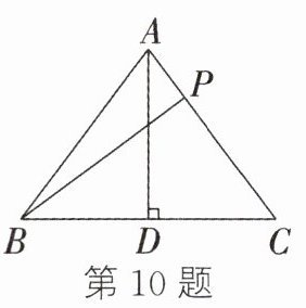 10. 如图,在三角形 $ ABC $ 中,$ AC = 5 $,$ BC = 6 $,边 $ BC $ 上的高 $ AD = 4 $。若点 $ P $ 在边 $ AC $ 上(不含端点)移动,则 $ BP $ 长的最小值为 _______。