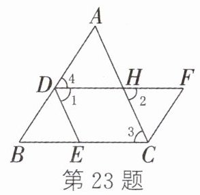 23. 如图,点D,E,H分别在三角形ABC的边AB,BC,AC上,连接DE,过点C作CF交DH的延长线于点F且满足∠B + ∠BCF = 180°. 若DE//AC,∠1 = ∠3,求证:∠B = ∠F.