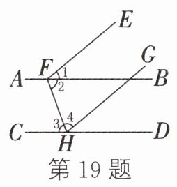 19. 如图,AB//CD,EF//GH,∠3 = ∠4. 若∠2 = 70°,则∠1的度数为________.