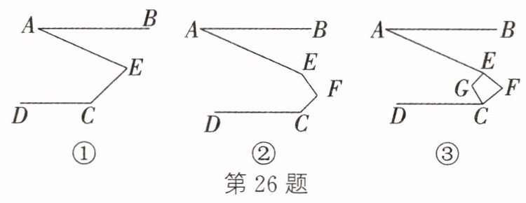 ② ∠G + $\frac{1}{2}$∠F = 168°。解析:因为 EG 为∠AEF 的平分线,CG 为∠DCF 的平分线,所以∠AEG = ∠GEF,∠DCG = ∠GCF。如图③,过点 E 作 EH//AB。因为 AB//CD,所以 EH//CD,∠AEH = ∠A = 24°。设∠HEG = x°,∠DCG = y°,则易得∠G = x° + y°,∠GEF = x° + 24°,∠GCF = y°。又因为易知∠HEF + ∠F + ∠FCD = 360°,∠HEF = 2x° + 24°,∠FCD = 2y°,所以 2x° + 24° + ∠F + 2y° = 360°。所以 2∠G + ∠F = 336°。所以∠G + $\frac{1}{2}$∠F = 168°。