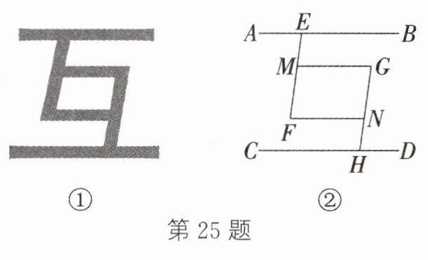 25. 中华文化博大精深,方块文字智慧灵秀,奥妙无穷. 如图①是一个“互”字,如图②是由图①抽象的几何图形,其中AB//CD,MG//FN,点E,M,F在同一条直线上,点G,N,H在同一条直线上,且∠EFN = ∠G.