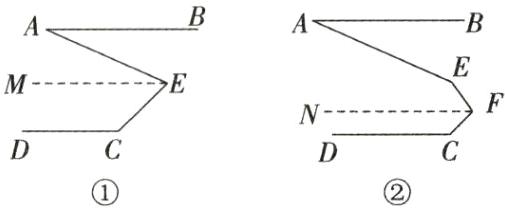 (2) ① 如图②,过点 F 作 FN//AB。因为 AB//CD,所以 AB//FN//CD。所以∠C + ∠NFC = 180°。所以∠C = 180° - ∠NFC。由