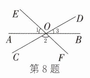 8. 如图,直线 AB,CD,EF 相交于点 O. 若∠1 + ∠2 + 2∠3 = 210°,则∠3 的度数为________.