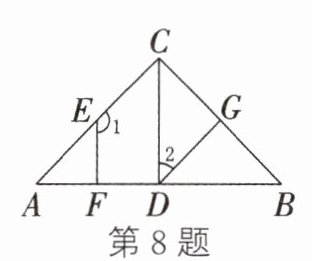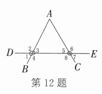 12. 如图,直线 $DE$ 截直线 $AB$,$AC$,构成标有数字记号的 8 个角.