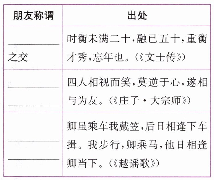 9. 下面是有关“朋友称谓”的部分资料,请在横线处填写对应的朋友称谓。