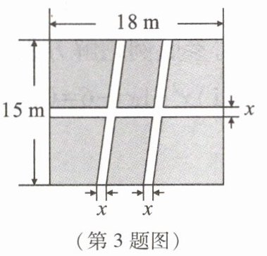 3. 链教材P43作业题第2题改编 如图,某市世纪广场有一块长方形绿地长18m,宽15m,在绿地中开辟三条道路后,剩余绿地的面积为224m²,则图中x为________。