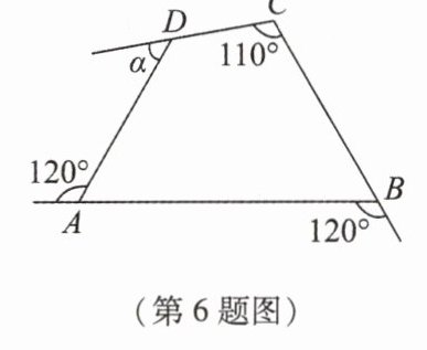 6 [2024·浙江杭州月考]如图,在四边形ABCD中,∠C = 110°,与∠BAD,∠ABC相邻的外角都是120°,则与∠ADC相邻的外角α的度数为 ( )