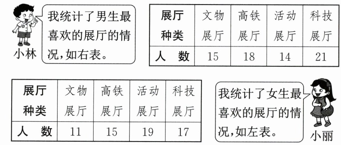 1. 周末,三年级学生参观了某博物馆,小林和小丽统计了学生们最喜欢的展厅情况。(每人限选一种)