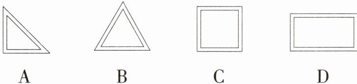 9. 难点[河北保定模拟]手工制作课上,小丽利用一些花布的边角料,剪裁后装饰手工画,下面四个图案是她剪裁出的空心等腰直角三角形、等边三角形、正方形、矩形花边,其中,每个图案花边的宽度都相等,那么每个图案中花边的内外边缘所围成的几何图形不一定相似的是 ( )