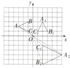 (2)以坐标原点O为位似中心,在x轴下方,画出△ABC的位似图形△A₂B₂C₂,使它与△ABC的相似比为2:1,并写出点B的对应点B₂的坐标.