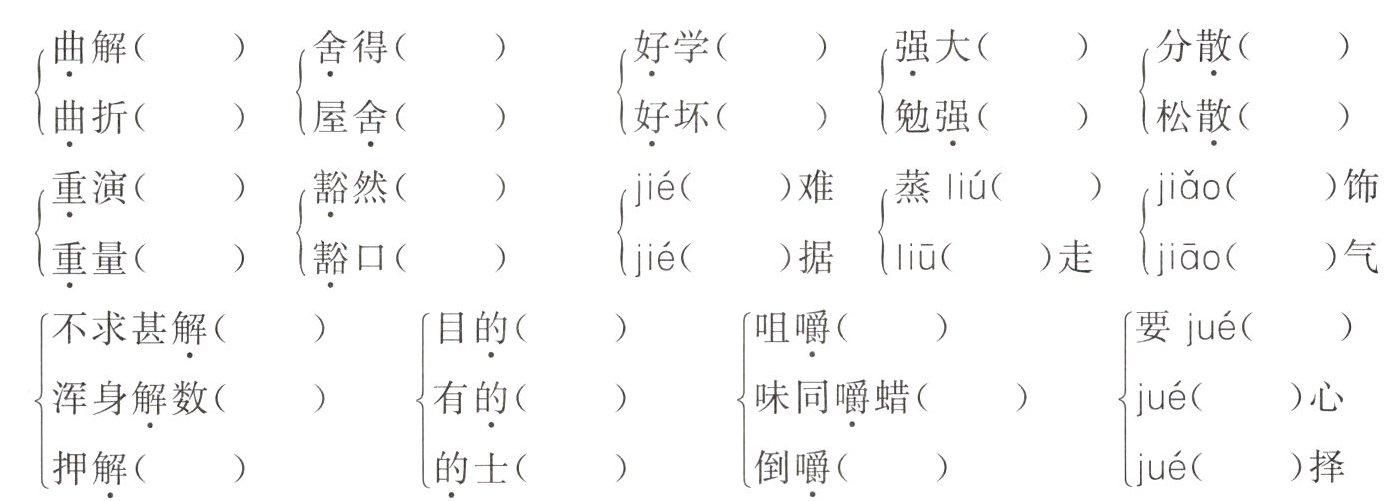 qū qǔ shě shè hào hǎo qiáng qiǎng sàn sǎn chóng zhòng huò huō 诘 拮 馏 溜 矫 娇 jiē xiè jiè dì de dī jué jiáo jiào 诀 决 抉
