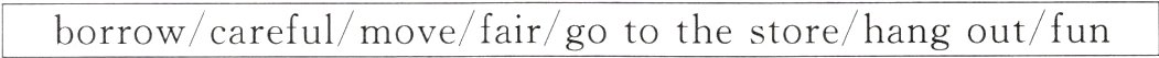 borrow/careful/move/fair/go to the store/hang out/fun