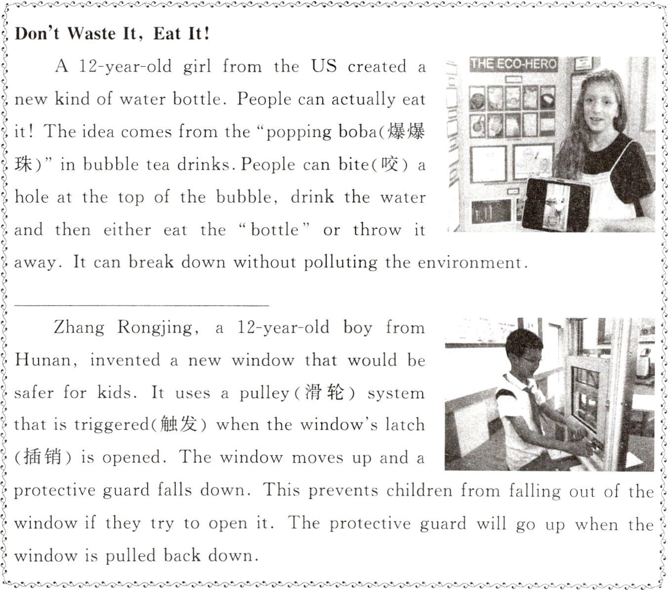 A 12-year-old girl from the US created a new kind of water bottle. People can actually eat it! The idea comes from the “popping boba(爆爆珠)” in bubble tea drinks. People can bite(咬) a hole at the top of the bubble, drink the water and then either eat the “bottle” or throw it away. It can break down without polluting the environment.