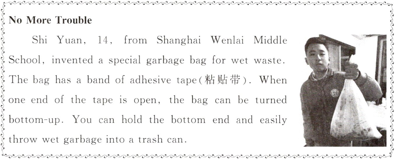 Shi Yuan, 14, from Shanghai Wenlai Middle School, invented a special garbage bag for wet waste. The bag has a band of adhesive tape(粘贴带). When one end of the tape is open, the bag can be turned bottom-up. You can hold the bottom end and easily throw wet garbage into a trash can.